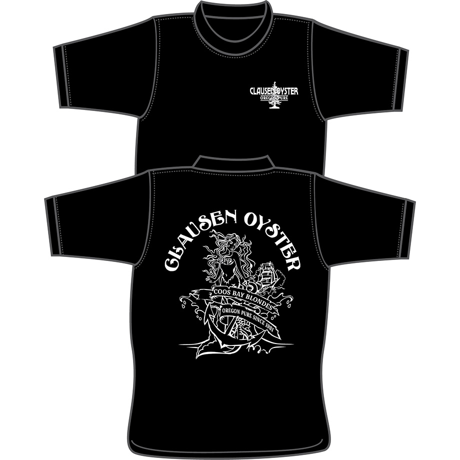 Black crew neck T-Shirt with Clausen Oysters logo on chest and Clausen Oysters mermaid on the back.
